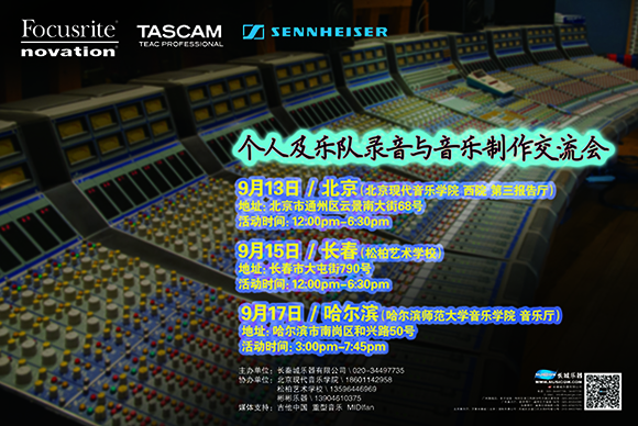 长城乐器公司将于2014年9月13日(周六);15日(周一)以及17日(周三)分别在北京、长春和哈尔滨举行个人及乐队录音与音乐制作交流会。免费进场,并提供丰富的产品进行抽奖,送给各位幸运观众,届时欢迎各位朋友到场。(大家请留意,这次的音乐...