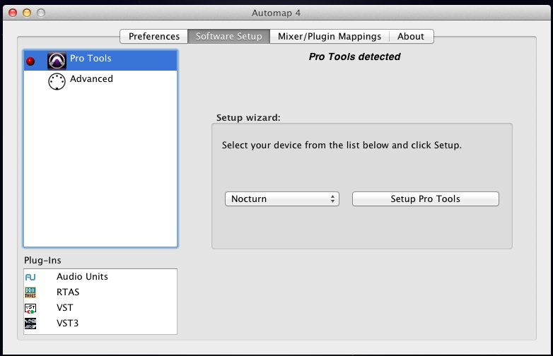 左边窗口里面会显示您的电脑里面已经安装好的音频软件。看下右边Setup wizard栏目项里面,左边下拉项目是选择你的要设置的控制器,这里咱们要设置的是Nocturn,右边下拉项目是选择你要设置的音频软件,这里我们选择Pro Tools.