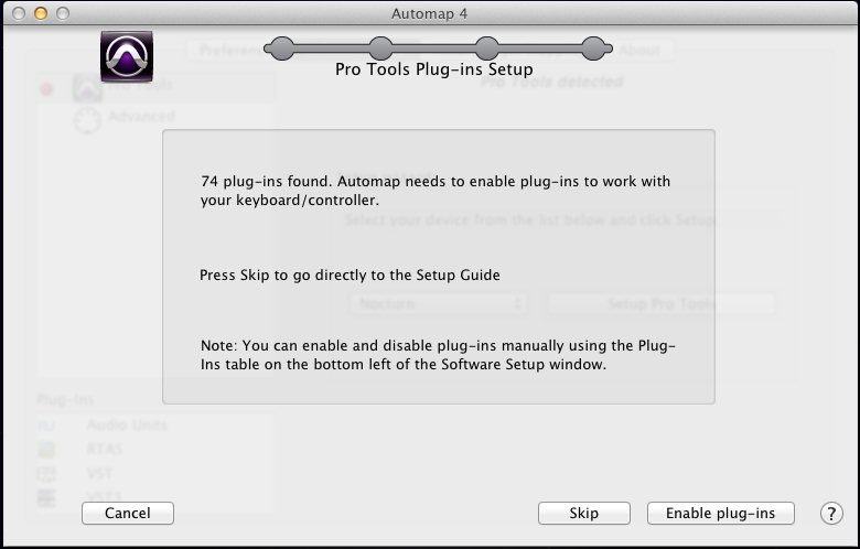 4.点击Setup Pro Tools,出现如下窗口,这个是激活您电脑里面所安装的所有插件的一个安装指导,因为激活之后我们的控制器就可以自动映射您的所有插件。不激活点击Skip。当然,我们现在要激活它,点击Enable plug-ins.