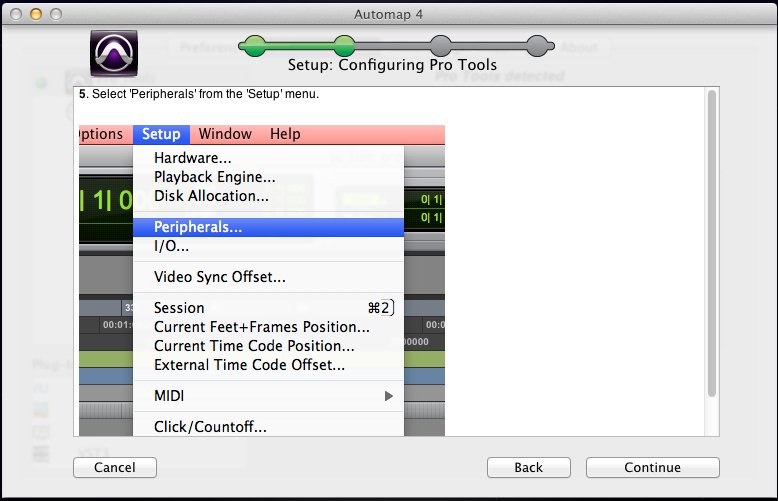 9.继续回到Pro Tools的状态栏,点击Setup下拉列表选项中的Peripherals,进行周边设备设置,然后点击Continue(继续):