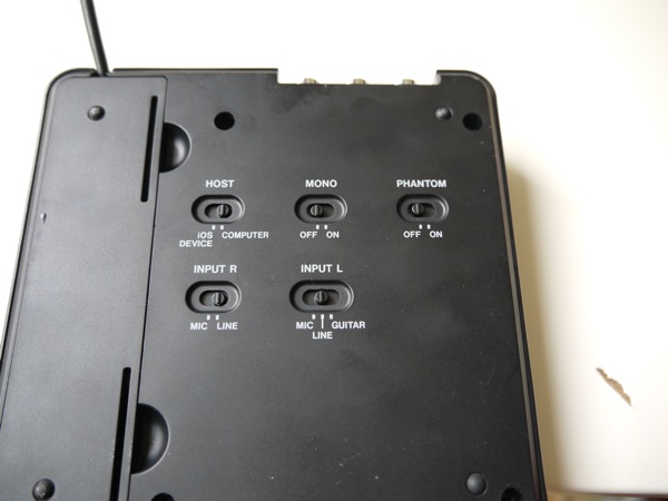 底部除了隐藏的dock线,还有好多的开关(如图7)。因为iU2不需要安装任何驱动(本来在iOS设备上也没法安装自己的驱动),所以相关的设置都需要在这里以硬件开关的形式操作。其实这样更直观,每次演出前扫一眼底部开关是否正确就OK了,而不需要到电脑那边打开软件再进入设置查看。5个开关包括:
