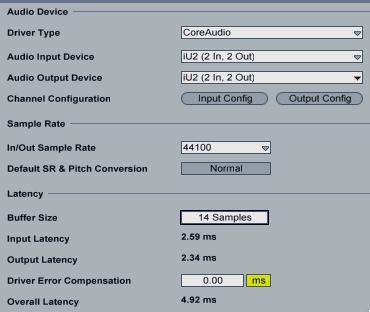 iOS和Mac的CoreAudio驱动几乎差不多,所以iU2在Mac下也可获得不错的性能,在512sample缓冲下延迟在13ms,最低的14sample降到最低的不到3ms,完全输入可用的范围(如图14、15)。