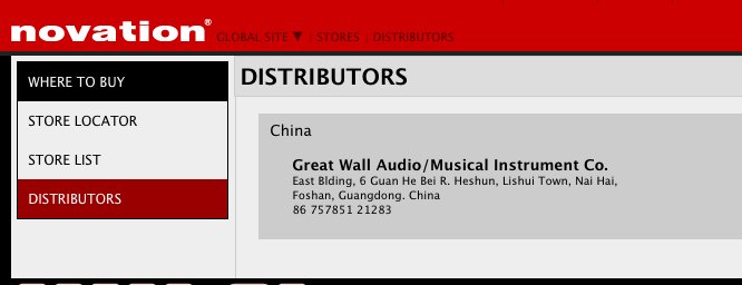 自2012年3月广州长城音响乐器有限公司(长城乐器)签约成为Novation中国区独家代理后,所有Novation的行货产品都应该是长城公司提供的产品,长城公司不设立零售,只供货给各大经销(代理)商,消费者在各大经销商购买产品的时候,应该提高辨识,确认是否长城公司代理的产品,否则一律是水货产品。