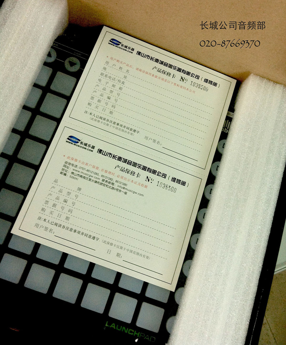 2. 长城公司出货的产品,内附长城公司产品保修卡一张,外包装有“长城乐器”logo贴标。