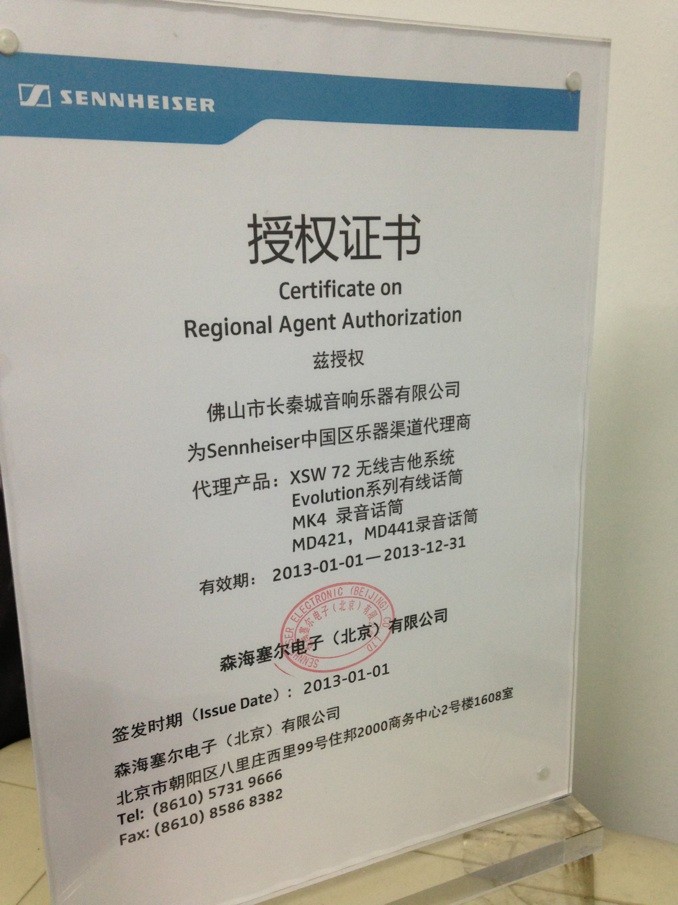 2013年新年伊始,森海塞尔电子(北京)有限公司Sennheiser与佛山市长秦城音响乐器有限公司(长城乐器)正式建立合作关系,森海塞尔授予佛山市长秦城音响乐器有限公司(长城乐器)“乐器渠道代理”。