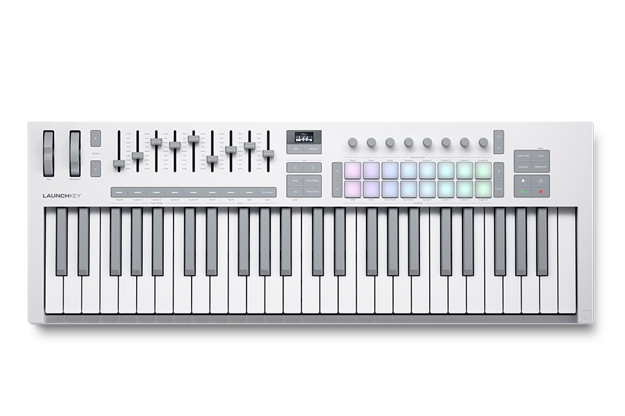 同样直观的 DAW 集成,同样强大的板载创意工具,时尚现代的配色。 Launchkey 49 White 配有 4 个八度的白色和灰色半配重琴键、16 个灵敏的复音触后打击垫、专用走带控制控件以及一系列可分配的推子、编码器旋钮和按钮,助您全面掌控创作。