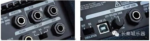 一个自带电平控制的耳机输出可以监听音箱或USB输出。后面板上还有带有电平和旁通功能的效果回路,一个3.5mm的aux-in插口,以及2个喇叭输出口,输出范围是0.5瓦到5瓦。还可以连接一个标准型的脚踏开关来选择不同的通道,以及添加混响效果。