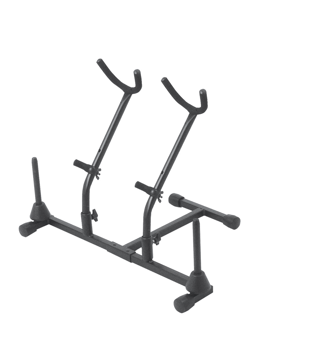76001 SXS7201B - 双萨克斯/长笛支架 可同时固定住2个萨克斯和2个长笛,所有接触表面有绒橡胶,可折平便于运输,黑色表面。
