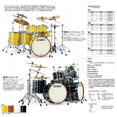 STARCLASSIC BUBINGA OMNI-TUNE Starclassic Bubinga Omni-Tune是为那些对音色与调整有着最严苛要求的鼓手而设计的。100%的bubinga鼓腔也同时提供了力量化的音头及丰富、全面的共振。为了获得更快、更简单和更精确的调节,Omni-Tune的鼓耳具有从打击面皮位置就可调整上下两张鼓皮的功能。对于长年在录音棚及大型现场工作的乐手而言,每一秒都极其珍贵,无疑,Omni-Tune就是他们的好选择。